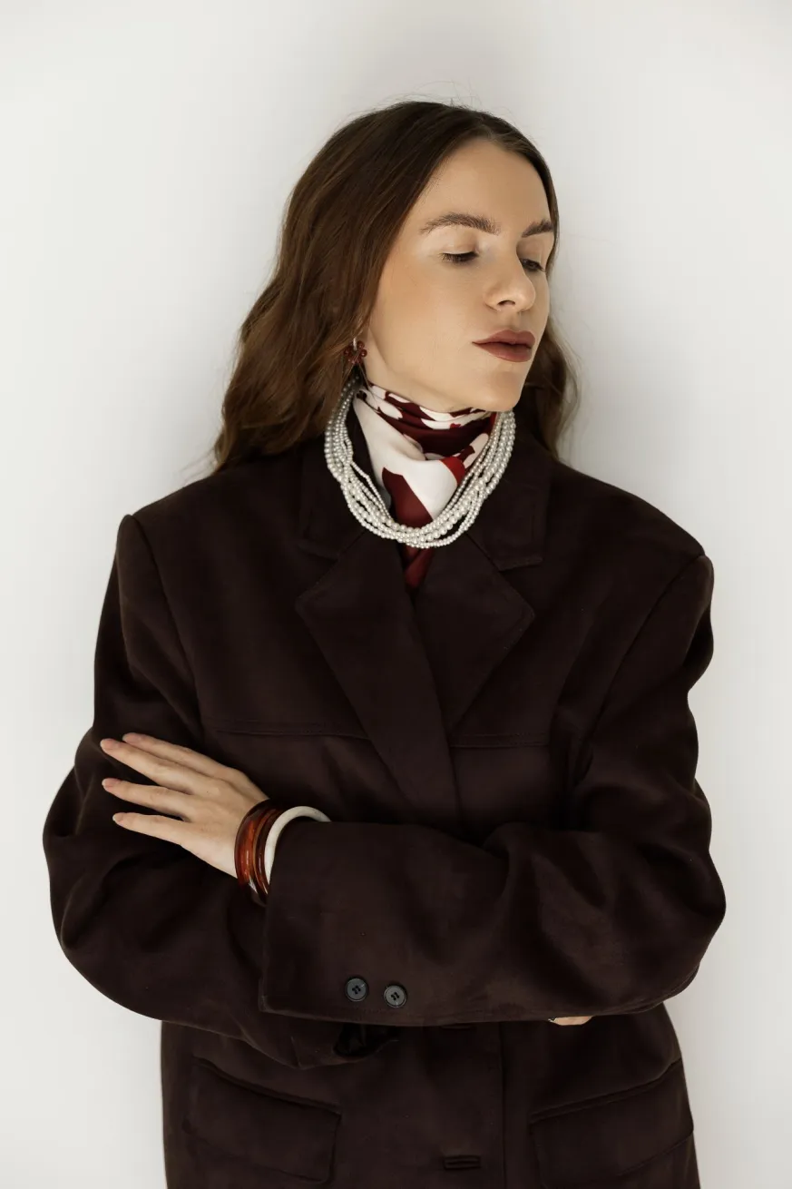 Обычным способом завяжите платок на шее и добавьте любимое украшение. Рекомендую поэкспериментировать с жемчугом.
