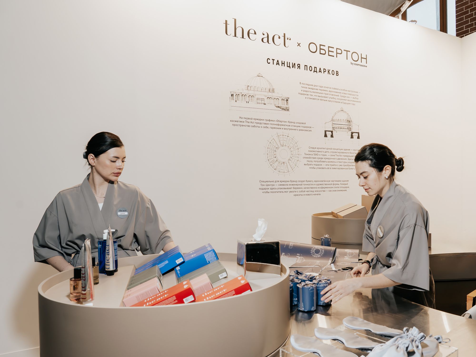 The Act представил «Станцию подарков» — магазин и лимитированную упаковочную бумагу, созданную специально для ярмарки «Обертон». Вдохновением послужили чертежи исторического здания, в котором расположен Тон-Центр, — первого в России кругового депо, созданного архитектором Константином Тоном в 1840-х годах.