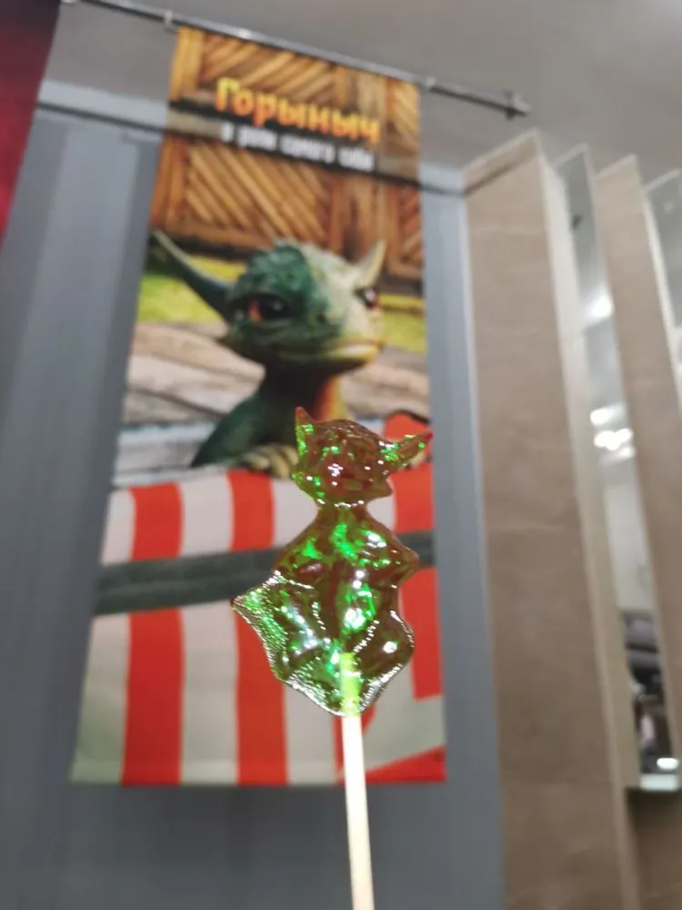 В фойе перед началом премьеры угощали баранками и леденцами в форме Горыныча.